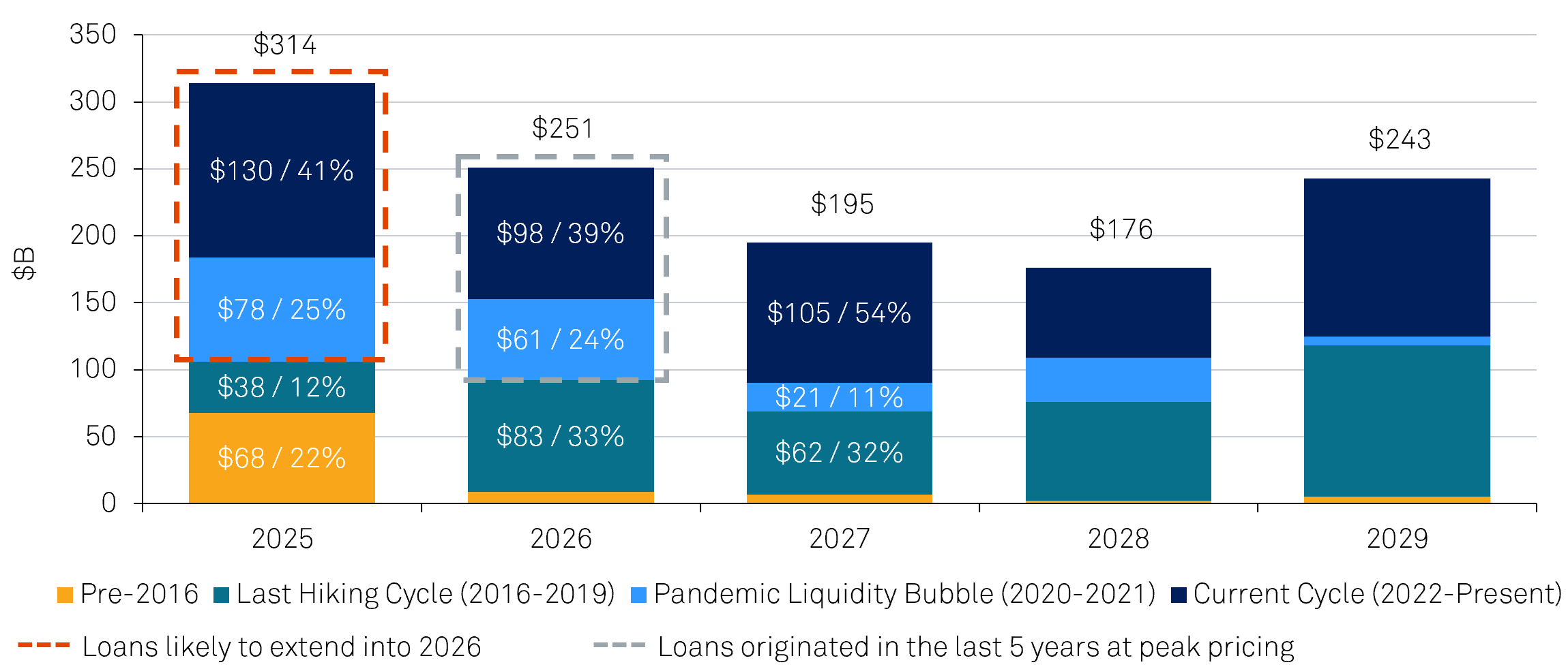 Importantly, pricing has not fully adjusted to this reality. In some markets, 4-5% cap rates still imply robust future rent growth and exit cap rate compression, leaving little margin for error. In contrast, public multifamily REITs are trading at implied cap rates of 6-6.5%, reflecting these challenged fundamentals. Meanwhile, a refinancing wave is building: loans originated in 2021–2022 at peak valuations and low interest rates are coming due (Figure 3). As senior loan proceeds are reduced to satisfy DSCR and LTV constraints under higher rates and lower valuations, gaps are emerging in the capital stack requiring new equity or structured capital.