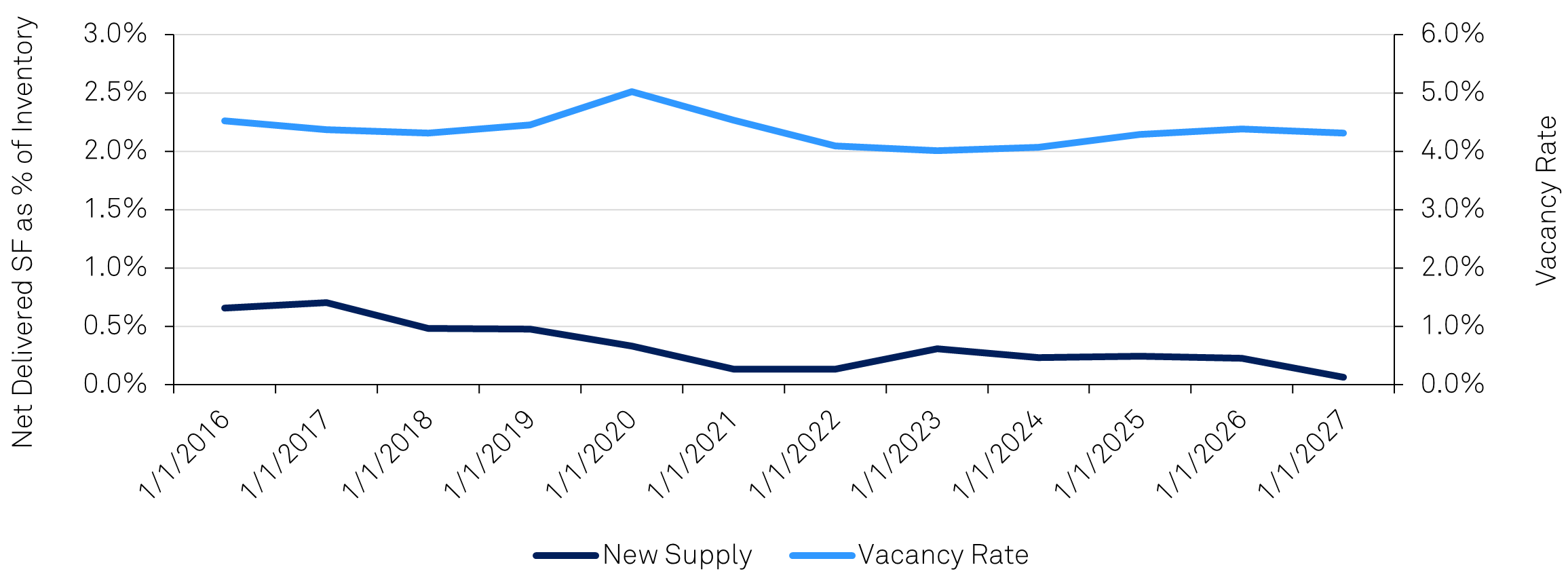 Industrial fundamentals peaked in 2021 and 2022 before softening under the weight of elevated supply. Today, conditions are stabilizing. Absorption has improved, leasing activity has normalized, and supply growth is decelerating. We believe most of the downside is in the rearview, placing industrial near the bottom of the cycle and at the early stages of recovery. Further, surveys show institutional investors continue to view industrial as one of the most appealing property types for 2026, reinforcing its position as a core focus area for capital deployment.